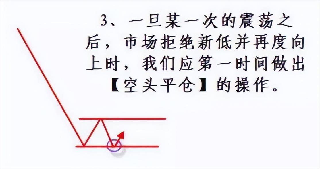 3、一旦某一次的震荡之后,市场拒绝新低并再度向上时,我们应第一时间做出【空头平仓】的操作。