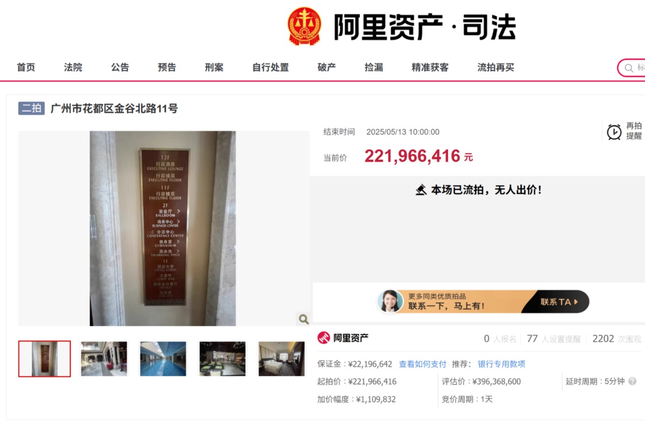 红星资本局5月13日消息,今日上午,广州富力空港假日酒店二拍流拍,此次拍卖共77人设置提醒,超2200次围观。